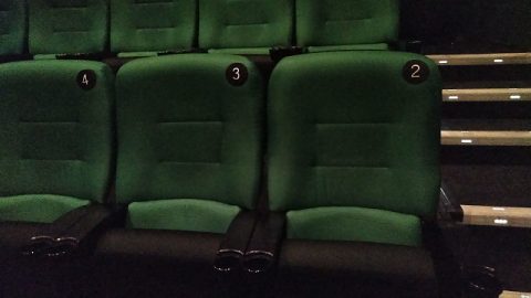 子供とジュースを買い、映画館内に入り、椅子に座ると何となく違和感が…。椅子と椅子の間にひじかけが2本っ‼