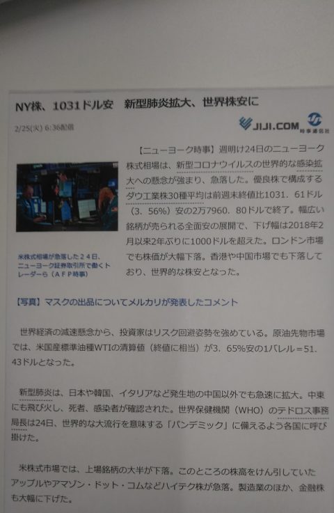 株の下落は新型コロナウイルスの影響とのことですが、相場への影響、中国で生産している製品への影響、など今後世界的な規模でどうなって行くか全く分からないような状況のようです。