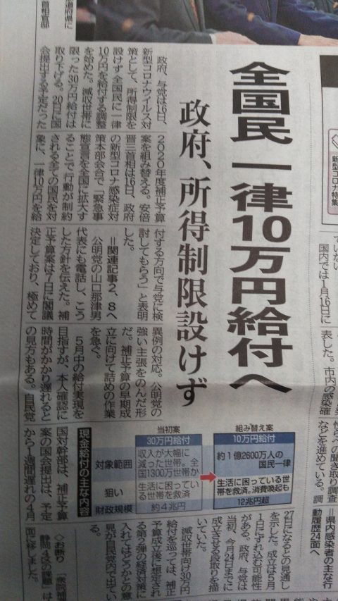 それに加えて、「国民一人に10万円の給付」‼これはさすがにビックリです。日本の人口が約1億2500万人ですから、一人ひとりに10万円を給付すると、総額12兆5000億円になります。これを来週国会で審議する予定だった補正予算案で検討するようです。