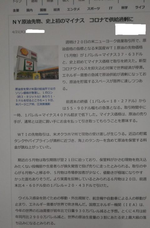 帳面上といいますか、理論上といいますか、数字上の市場ですので、原油価格がマイナスになっておりますが、実際の現物取引でお金を払って油を引き取ってもらうような話はありえないと思うのですが、今後どのようになっていくのは注目です。