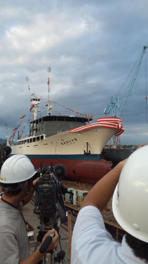 新松友丸の進水式の写真。誰にテープカットさせる⁈なんて騒いでいたように思います。”生娘”でなきゃダメだってよ!エエッ‼生娘ってどこにいる? なんてネ。