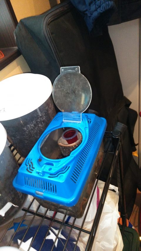 玄関のクワガタを入れていた水槽から数メートル、なんでかな?と水槽を確認すると青いフタの真ん中に付いている透明の観察用か餌やり用に使用するフタがしっかり閉まっておらず、おそらくそこから逃げたのではないかと思われます。