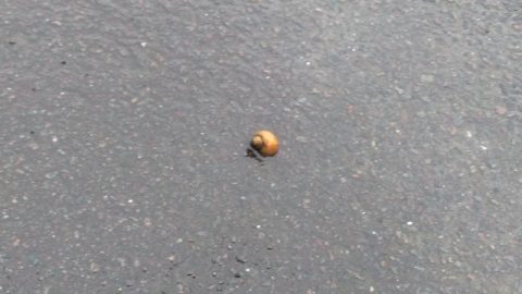 今朝、家の周りを歩いていますと道路の真ん中にカタツムリ発見。