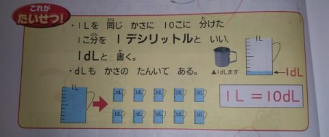 ネットで調べますとご存じの通り”1リットル=10デシリットル=1000ミリリットル=1000cc”と載っております。あるH.P.の説明では”デシリットルはヨーロッパのレシピなどでよく使われる”とありましたが、少なくともうちの家族はほとんどヨーロッパのレシピは見ませんし、”デシリットル”を習う全国の小学2年生うちヨーロッパのレシピを見る子も限られているように思います。