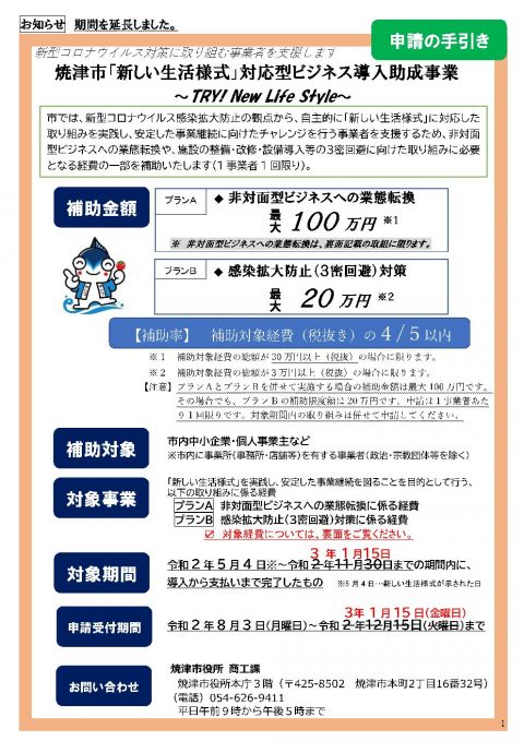 焼津市より出ております”「新しい生活様式」対応型ビジネス導入助成事業”の対象期間、申請受付期間が延長となりました。