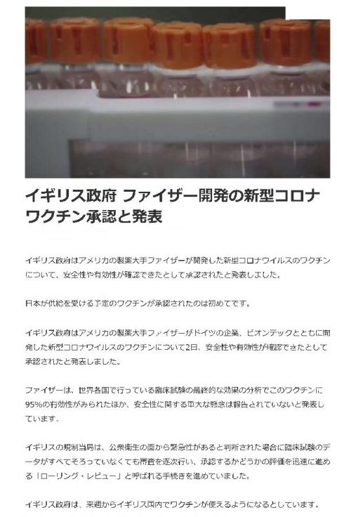 昨晩ニュースでイギリス政府がファイザー社が開発した新型コロナウイルスのワクチンを承認したというのを観ました。