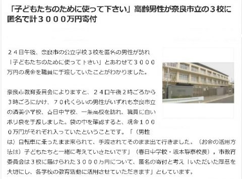 内容は70代ぐらいの男性が「子供たちのために使ってください」と奈良市立の小学校、中学校、高校にそれぞれ1000万円の入った白いポリ袋を手渡したとのことでした。その小中高校がなんとすべてが私の母校でした。