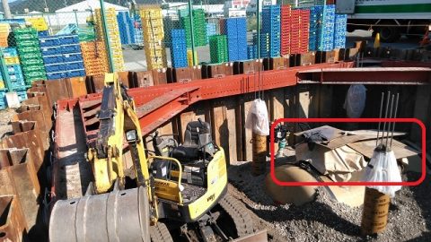 タンクはFRP樹脂製なので破損しないように丁寧に埋めていきます。また配管を接続するピット部分(赤い線の内側)に土が入らないように養生して作業を進めていきます。