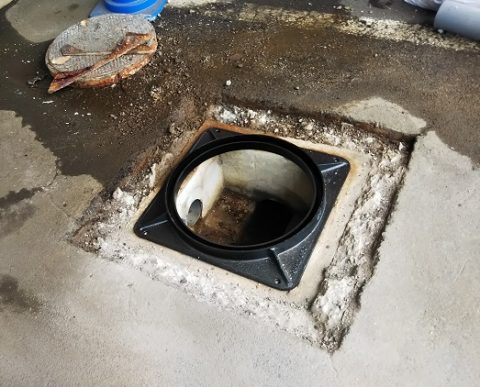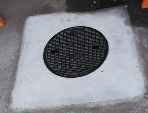古いマンホールの蓋と枠を新しいモノに入れ替え、