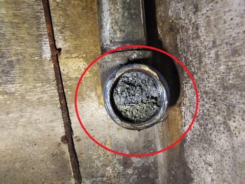 配管いっぱいに砂混じりの泥が溜まっていました。約半年前にマンホールから高圧洗浄のホースを入れ、屋上へ立ち上がっている管の1m上付近まで洗浄したのですが、その上から泥が落ちてきたのか、配管内のこの状態にビックリしました。