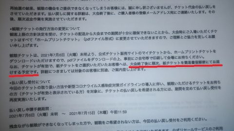 内容は報道されているオリンピックの入場者数の制限やそれに伴う観戦チケットの再抽選などの他、チケットのキャンセルや払い戻しについての案内でした。