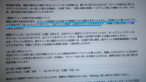 「まあ、後々の記念にするために紙チケットにしたので、後日郵送でもいいか」と思いましたが、これについては払い戻しの選択肢はないんだとも思いました。紙チケットを申し込んだ方々の感想が聞きたい気もしました。