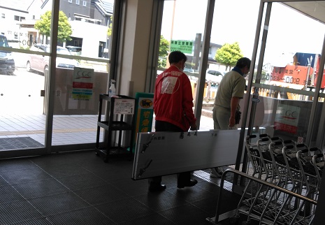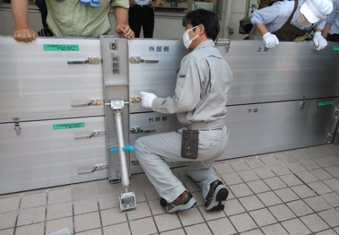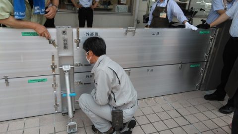 この止水板で一昨年の台風時のような洪水になっても、店内への水の侵入を防ぐことができます。地盤が低いなど、大雨の際に水が屋内に侵入することでお困りでしたら、是非一度弊社までお問い合わせください。