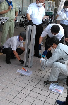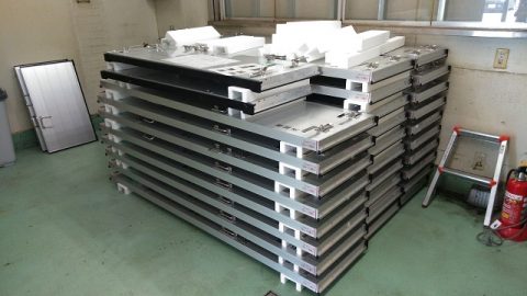 まずは保管場所にある止水板、柱などを運び出します。止水板は二人で1枚を運びました。