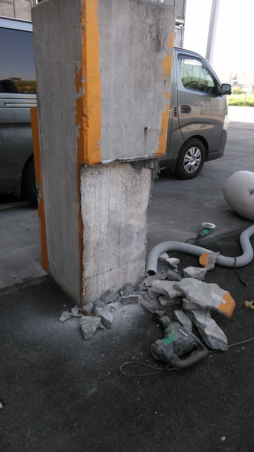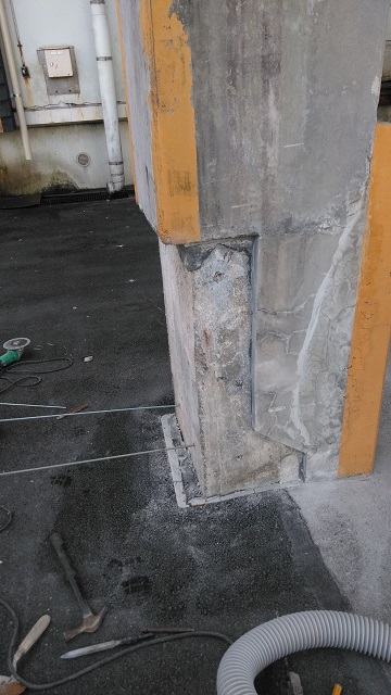 柱の現場調査と写真を社内で確認したところ、柱の損傷個所はモルタルで出来ており、その内部は数ミリの空間を挟み、コンクリートの柱があることが分かりました。そして補修は元々と同じようにモルタルで行うか、コンクリートで行うかという話になりました。