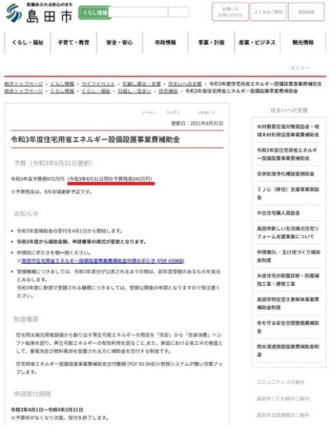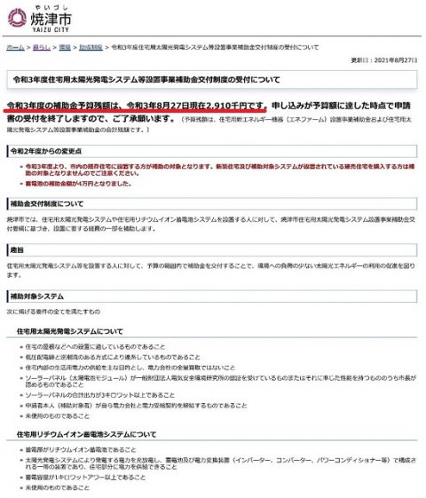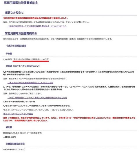 台風の影響で停電を警戒しなければならなくなると話題になることの一つが蓄電池ですが、今年度の焼津市・藤枝市・島田市の蓄電池関連の補助金の残高状況を紹介させていただきます。