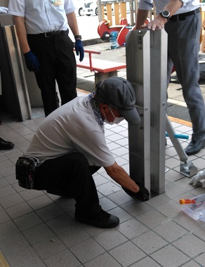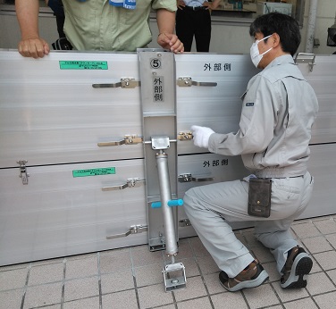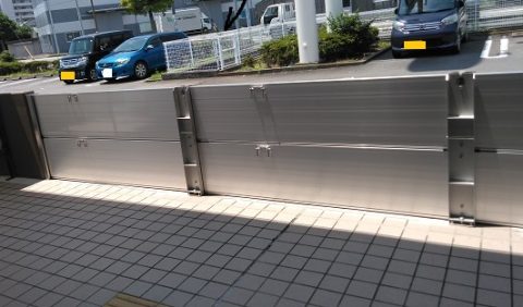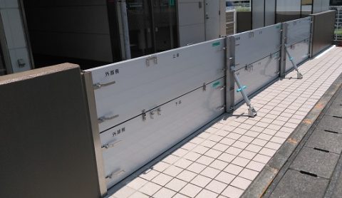 設置するとこのようになります。これで周囲からの水の侵入を防ぎます。また店内にある下水管から水が逆流して侵入してくる可能性もあります。こちらには下水管の中に逆止弁を設置し、逆流を防ぐ対策をとっております。