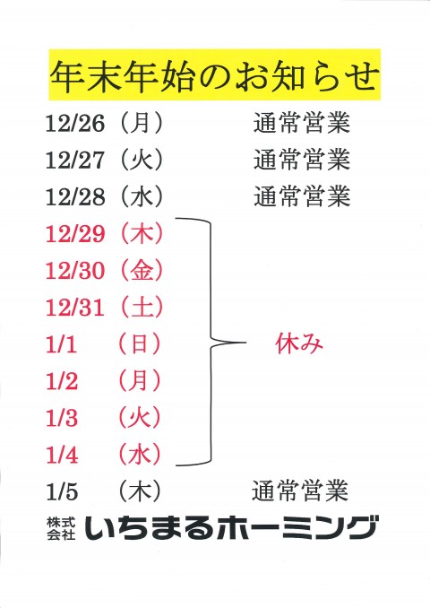 お知らせ・イベント情報 年末年始のお知らせです! 2016年12月26日(月) 今年もあと6日ですね。 いろんな方々にお世話になりました。 弊社、いちまるホーミングの、年末年始のお知らせです。 来年も、よろしくお願いします♪ 前へ一覧へ次へ 最新記事 2022年4月1日(金) 2022年5月7日(土)は、女性一級建築士による個別リフォーム相談会開催です!! 2022年3月14日(月) 3月20日(日)は、女性一級建築士による個別リフォーム相談会開催です!! 2022年3月4日(金) 2022年4月2日(土)は、女性一級建築士による個別リフォーム相談会開催です!! 一覧へ カテゴリー別 イベント情報 お知らせ その他 カレンダー 2025年12月 日 月 火 水 木 金 土 « 4月 123456 78910111213 14151617181920 21222324252627 28293031 月別アーカイブ ブログ一覧 お知らせ・イベント情報 エネルギー事業 リフォーム 不動産 店舗・工場・事務所