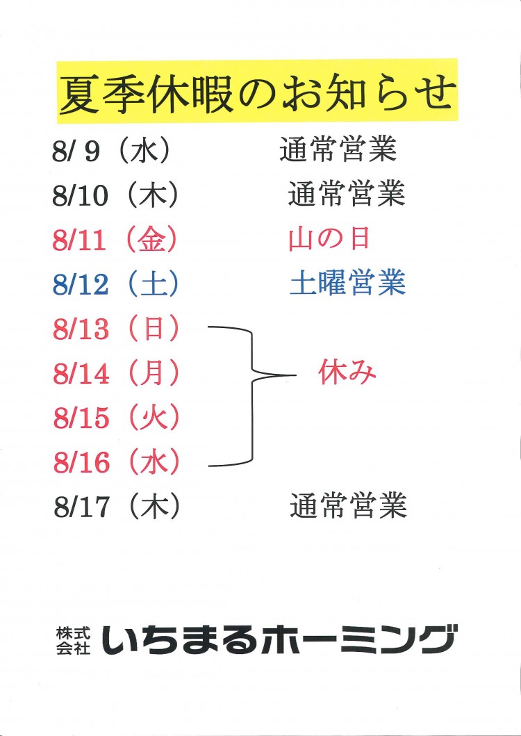 お知らせ・イベント情報 夏季休暇のお知らせです 2017年8月8日(火) —夏季休暇のお知らせです♪— 暑い日が続きますが、いかがお過ごしですか? いちまるホーミングでは、旧のお盆に合わせて 夏季休暇をとらせていただきます。 よろしくお願いします。 前へ一覧へ次へ 最新記事 2022年4月1日(金) 2022年5月7日(土)は、女性一級建築士による個別リフォーム相談会開催です!! 2022年3月14日(月) 3月20日(日)は、女性一級建築士による個別リフォーム相談会開催です!! 2022年3月4日(金) 2022年4月2日(土)は、女性一級建築士による個別リフォーム相談会開催です!! 一覧へ カテゴリー別 イベント情報 お知らせ その他 カレンダー 2025年12月 日 月 火 水 木 金 土 « 4月 123456 78910111213 14151617181920 21222324252627 28293031 月別アーカイブ ブログ一覧 お知らせ・イベント情報 エネルギー事業 リフォーム 不動産 店舗・工場・事務所