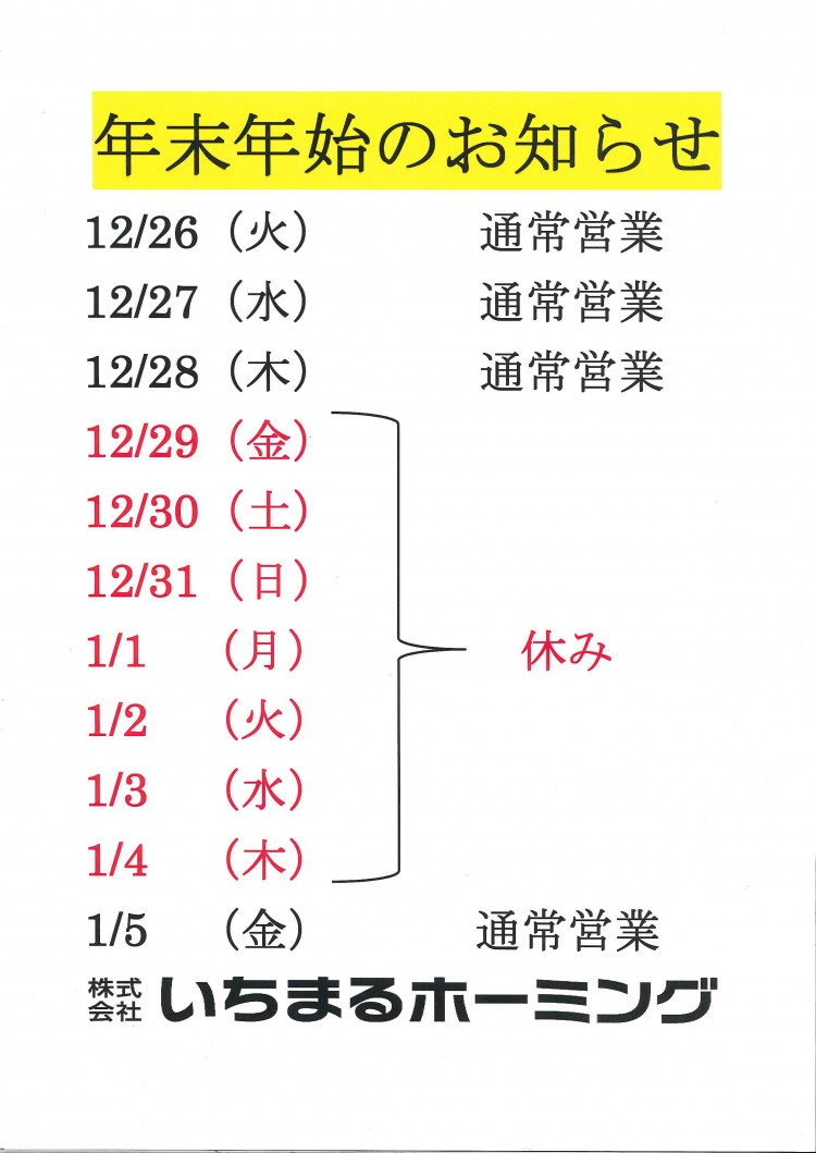 お知らせ・イベント情報 年末年始のお知らせです! 2017年12月26日(火) 今年もあと6日ですね。 いろんな方々にお世話になりました。 弊社、いちまるホーミングの、年末年始のお知らせです。 来年も、よろしくお願いします♪ 前へ一覧へ次へ 最新記事 2022年4月1日(金) 2022年5月7日(土)は、女性一級建築士による個別リフォーム相談会開催です!! 2022年3月14日(月) 3月20日(日)は、女性一級建築士による個別リフォーム相談会開催です!! 2022年3月4日(金) 2022年4月2日(土)は、女性一級建築士による個別リフォーム相談会開催です!! 一覧へ カテゴリー別 イベント情報 お知らせ その他 カレンダー 2025年12月 日 月 火 水 木 金 土 « 4月 123456 78910111213 14151617181920 21222324252627 28293031 月別アーカイブ ブログ一覧 お知らせ・イベント情報 エネルギー事業 リフォーム 不動産 店舗・工場・事務所