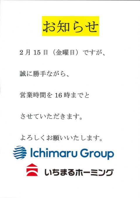 お知らせ・イベント情報 営業時間短縮のおしらせ 2019年2月14日(木) 営業時間短縮のお知らせです。 2月15日(金曜日)は、まことに勝手ながら 営業時間を16時までとさせていただきます。 よろしくお願い致します。 前へ一覧へ次へ 最新記事 2022年4月1日(金) 2022年5月7日(土)は、女性一級建築士による個別リフォーム相談会開催です!! 2022年3月14日(月) 3月20日(日)は、女性一級建築士による個別リフォーム相談会開催です!! 2022年3月4日(金) 2022年4月2日(土)は、女性一級建築士による個別リフォーム相談会開催です!! 一覧へ カテゴリー別 イベント情報 お知らせ その他 カレンダー 2025年12月 日 月 火 水 木 金 土 « 4月 123456 78910111213 14151617181920 21222324252627 28293031 月別アーカイブ ブログ一覧 お知らせ・イベント情報 エネルギー事業 リフォーム 不動産 店舗・工場・事務所