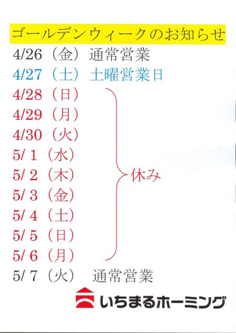 お知らせ・イベント情報 ゴールデンウィークのお知らせです 2019年4月26日(金) いつもお世話になっております。 いちまるホーミングの、ゴールデンウィークのお知らせです♪ よろしくお願いいたします。 前へ一覧へ次へ 最新記事 2022年4月1日(金) 2022年5月7日(土)は、女性一級建築士による個別リフォーム相談会開催です!! 2022年3月14日(月) 3月20日(日)は、女性一級建築士による個別リフォーム相談会開催です!! 2022年3月4日(金) 2022年4月2日(土)は、女性一級建築士による個別リフォーム相談会開催です!! 一覧へ カテゴリー別 イベント情報 お知らせ その他 カレンダー 2025年12月 日 月 火 水 木 金 土 « 4月 123456 78910111213 14151617181920 21222324252627 28293031 月別アーカイブ ブログ一覧 お知らせ・イベント情報 エネルギー事業 リフォーム 不動産 店舗・工場・事務所