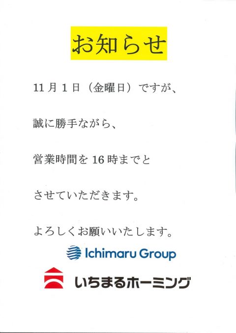 お知らせ・イベント情報 営業時間短縮のおしらせ 2019年10月31日(木) 営業時間短縮のお知らせです。 11月1日(金曜日)は、まことに勝手ながら 営業時間を16時までとさせていただきます。 よろしくお願い致します。 前へ一覧へ次へ 最新記事 2022年4月1日(金) 2022年5月7日(土)は、女性一級建築士による個別リフォーム相談会開催です!! 2022年3月14日(月) 3月20日(日)は、女性一級建築士による個別リフォーム相談会開催です!! 2022年3月4日(金) 2022年4月2日(土)は、女性一級建築士による個別リフォーム相談会開催です!! 一覧へ カテゴリー別 イベント情報 お知らせ その他 カレンダー 2025年12月 日 月 火 水 木 金 土 « 4月 123456 78910111213 14151617181920 21222324252627 28293031 月別アーカイブ ブログ一覧 お知らせ・イベント情報 エネルギー事業 リフォーム 不動産 店舗・工場・事務所