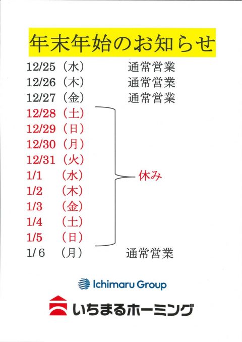 お知らせ・イベント情報 年末年始のお知らせです! 2019年12月24日(火) 今年もあと6日ですね。 いろんな方々にお世話になりました。 弊社、いちまるホーミングの、年末年始のお知らせです。 2019年4月から、エネルギー部が統合しましたので、 エネルギー部門と建設部門でお休みが違います。 まず、 ●エネルギー部門 焼津市栄町にあります、いちまるホーミング焼津S/S。 12/29(日)~12/31(火)は短縮営業 年始は1/4(土)が短縮営業 となり 1/6(月)より通常営業とさせていただきます。 ●建設部門 来年も、よろしくお願いします♪ 前へ一覧へ次へ 最新記事 2022年4月1日(金) 2022年5月7日(土)は、女性一級建築士による個別リフォーム相談会開催です!! 2022年3月14日(月) 3月20日(日)は、女性一級建築士による個別リフォーム相談会開催です!! 2022年3月4日(金) 2022年4月2日(土)は、女性一級建築士による個別リフォーム相談会開催です!! 一覧へ カテゴリー別 イベント情報 お知らせ その他 カレンダー 2025年12月 日 月 火 水 木 金 土 « 4月 123456 78910111213 14151617181920 21222324252627 28293031 月別アーカイブ ブログ一覧 お知らせ・イベント情報 エネルギー事業 リフォーム 不動産 店舗・工場・事務所